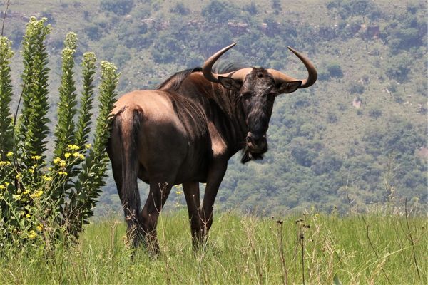 The black wildebeest (Connochaetes gnou ) or white-tailed gnu, is one of the two closely related wildebeest species. It is a member of the genus Connochaetes and family Bovidae. It was first described in 1780 by Eberhard August Wilhelm von Zimmermann. The black wildebeest is typically 170–220 cm (67–87 in) in head-and-body length, and the typical weight is 110–180 kg (240–400 lb). Males stand about 111–121 cm (44–48 in) at the shoulder, while the height of the females is 106–116 cm (42–46 in). The black wildebeest is characterised by its white, long, horse-like tail. It also has a dark brown to black coat and long, dark-coloured hair between its forelegs and under its belly. The black wildebeest is an herbivore, and almost the whole diet consists of grasses. Water is an essential requirement. The three distinct social groups are the female herds, the bachelor herds, and the territorial bulls. They are fast runners and communicate using a variety of visual and vocal communications. The primary breeding season for the black wildebeest is from February to April. A single calf is usually born after a gestational period of about 8 and a half months. The calf remains with its mother until her next calf is born a year later. The black wildebeest inhabits open plains, grasslands, and Karoo shrub lands. The natural populations of black wildebeest, endemic in the southern part of Africa, were almost completely exterminated in the 19th century, due to their reputation as pests and the value of their hides and meat. However, the species has been reintroduced widely from captive specimens, both in private areas and nature reserves throughout most of Lesotho, Eswatini, and South Africa. The species has also been introduced outside its natural range in Namibia and Kenya.